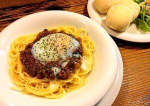 • きのこの温玉のせミートソースパスタmm